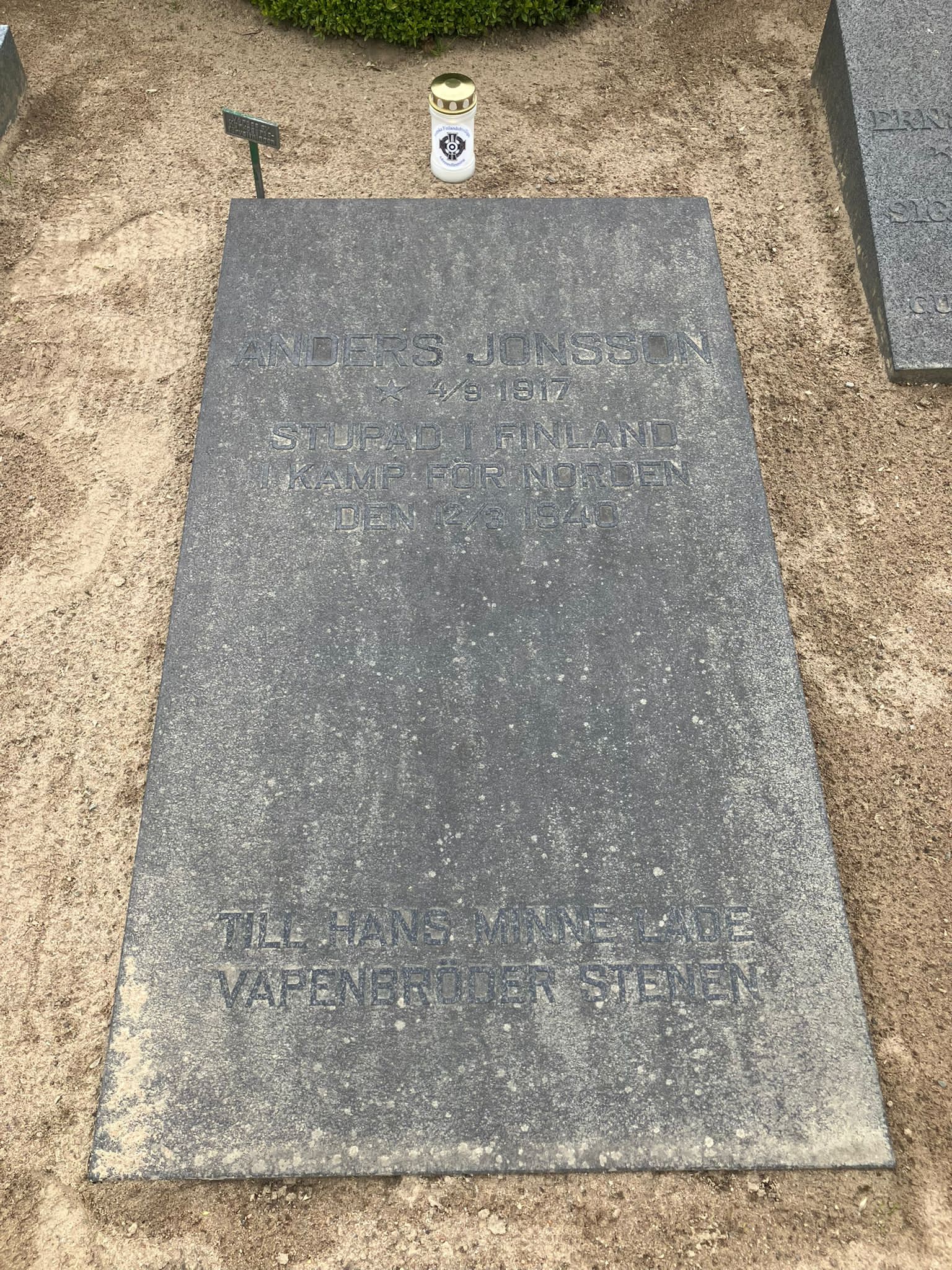 1940 Gravsten över finlandsfrivillige Anders Jonsson på Matteus begravningsplats, Norrköping