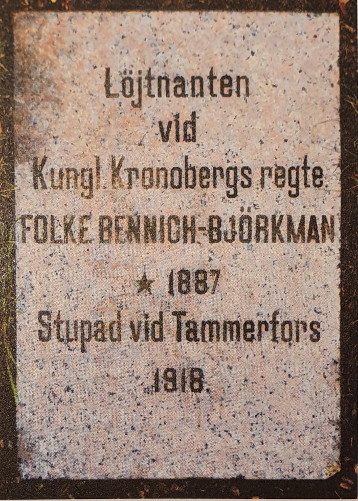 Löjtnanten Folke Viktor Bennich-Björkman vid Kronobergs regemente var bataljonchef vid Svenska brigaden, en svensk styrka som satts upp i Stockholm i januari 1918, och som deltog i striderna på den vita sidan. Bennich-Björkman dödades den blodiga skärtorsdagen den 28 mars i samband med slaget vid Tammerfors. Hans kropp fördes hem till Sverige och begravdes i Kalmar, där han haft sitt hem.