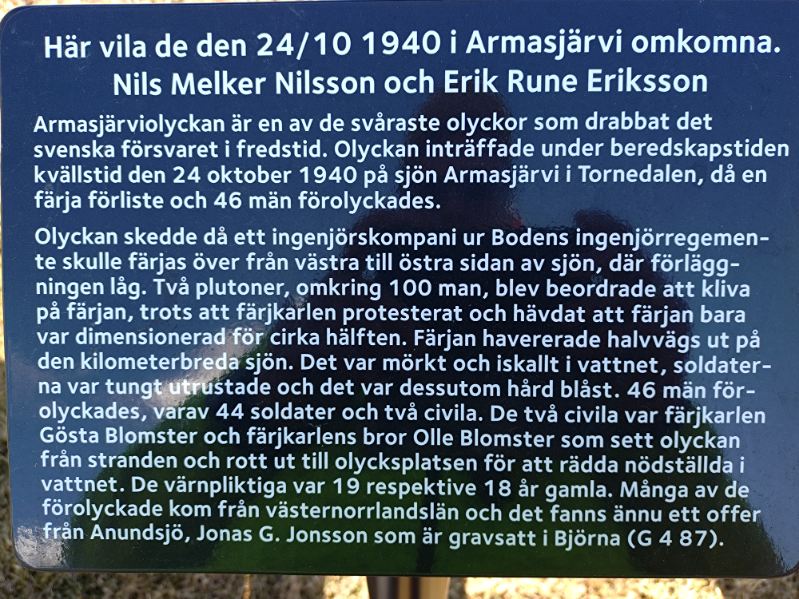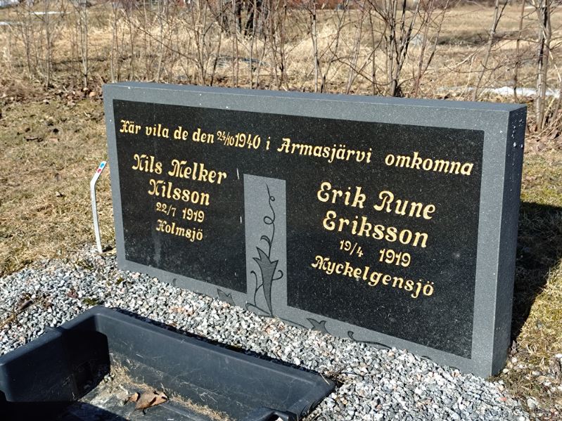 1940 Gravsten över de i Armasjärvi omkomna Nils Melker Nilsson och Erik Rune Eriksson på Anundsjö kyrkogård, Bredbyn